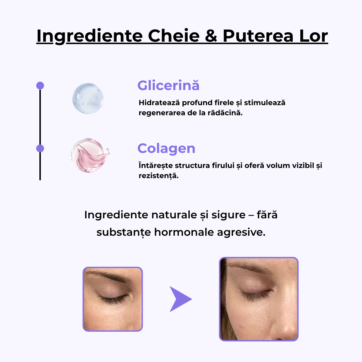- Fără analogi de prostaglandină (fără iritații sau pigmentare a pielii)
